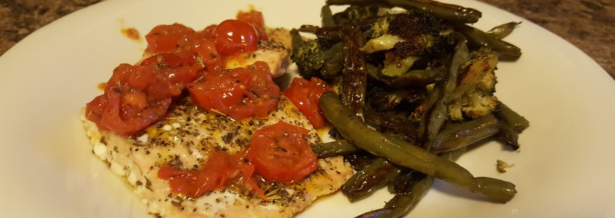 When the oven temperature was right, I set the veggies to roast for 30 minutes. During this time I sliced some grape tomatoes to saute for a salmon topping. In a small pan with olive oil, I seasoned the tomatoes with salt, pepper, garlic powder, and Italian seasoning. The tomatoes only cooked for a few minutes and I removed them from heat so they would maintain some firmness.