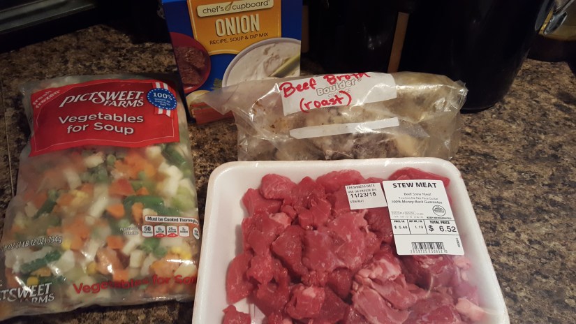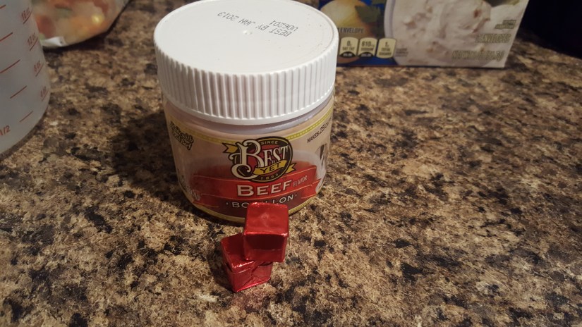 Then the beef broth…frozen cubes and bullion. Ok, let’s talk about this! A while back, I made a really tasty roast in the crock pot. There were lots of flavorful juices left over, so I poured the juice/broth into ice trays to freeze for later!