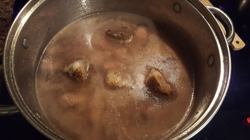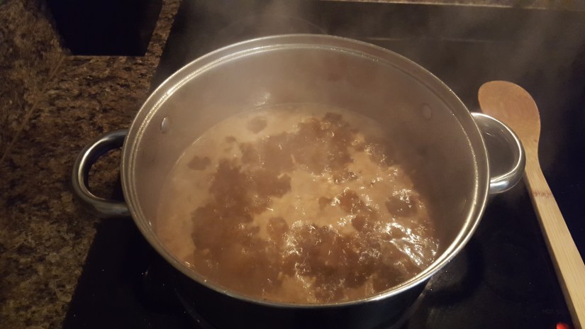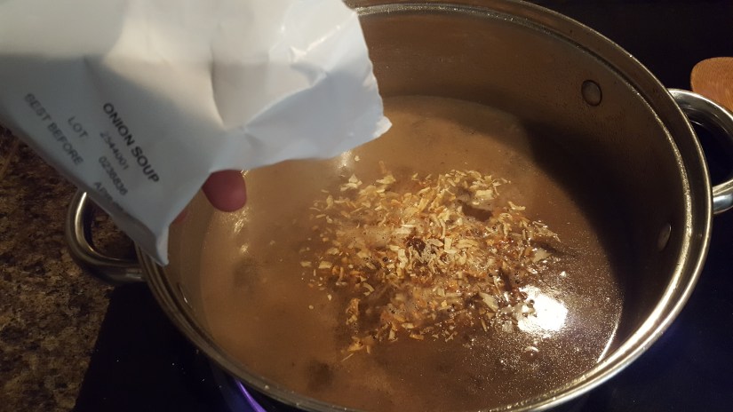 After the broth, I added a whole pack of Onion Soup Mix then brought the mixture to a boil.