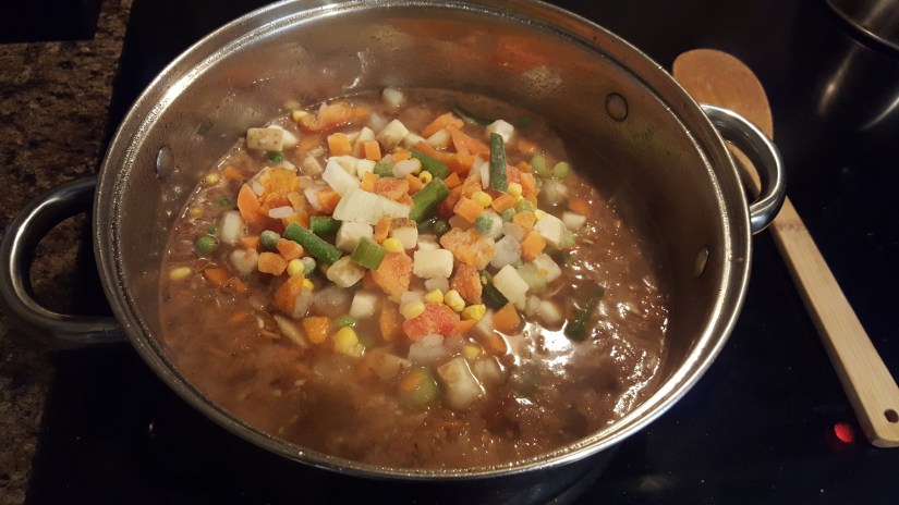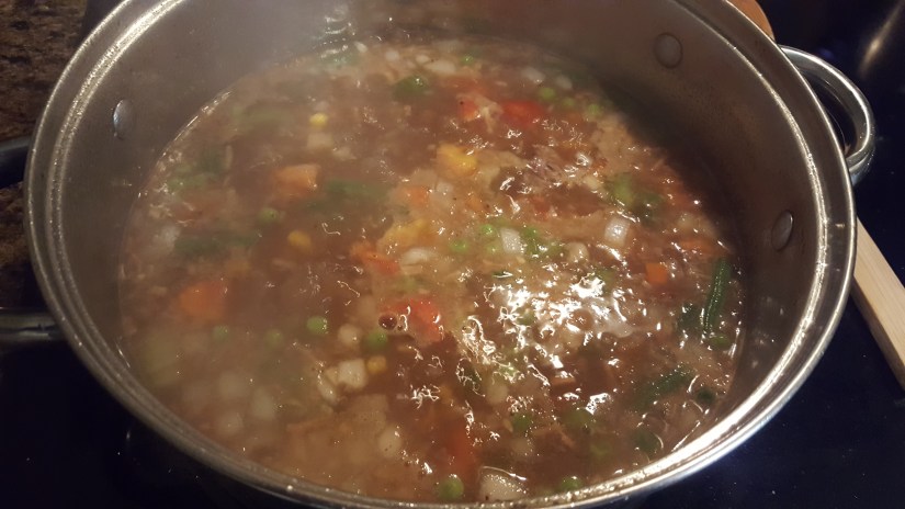 Finally, I added the bag of veggies…brought it back to a boil…then lowered the heat so the soup could simmer for about 30 minutes.