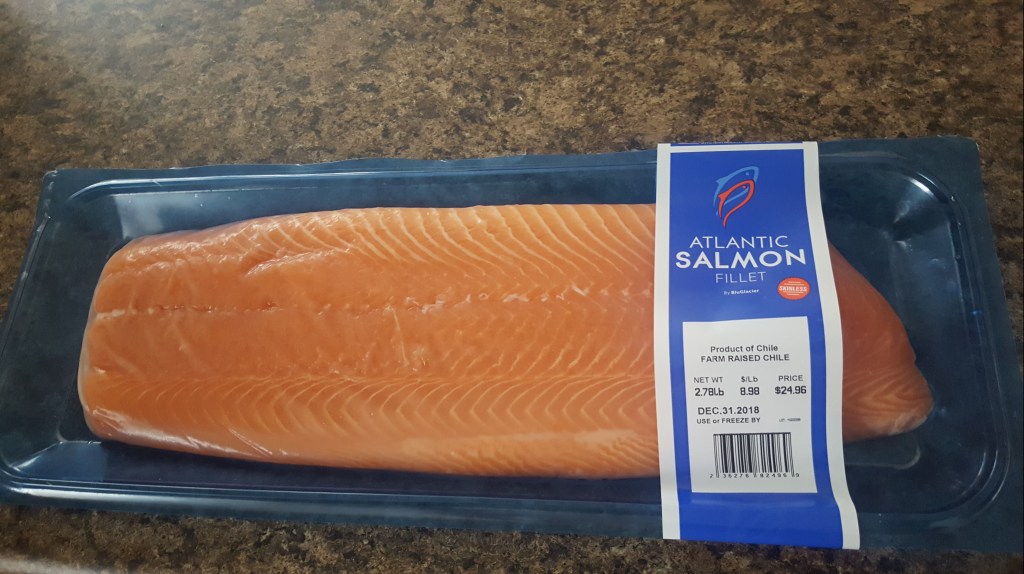 I purchased this salmon from Sam’s. Have I ever mentioned how much I love Sam’s Club? Well, I do!!!!! I love buying in bulk…spices, cereal, juice, meat, YOU NAME IT! Their $1.50 hot dog combo doesn’t hurt either!