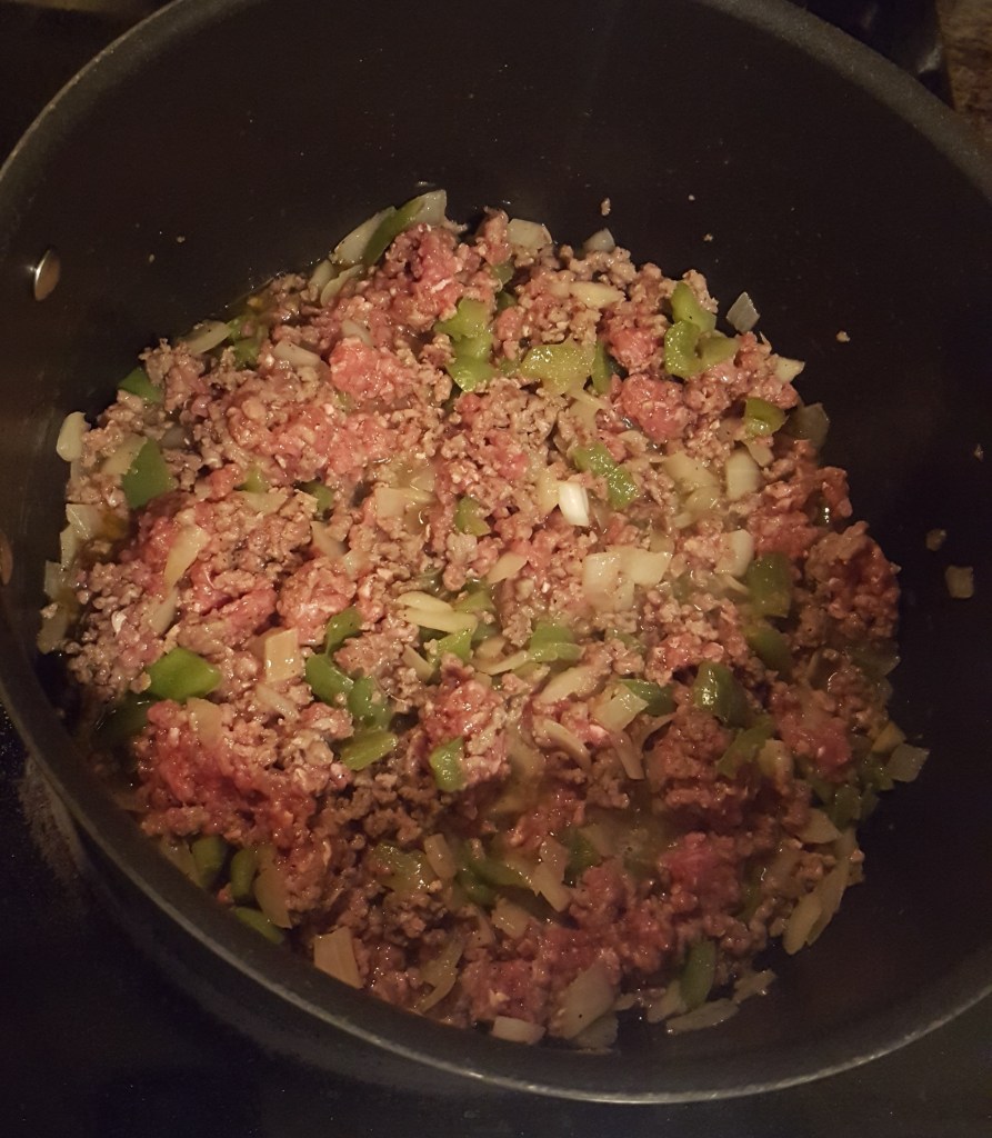 Brown the ground beef with some chopped onion and green pepper. I used half of each, but add as much as you like. Drain, then season with salt and pepper.
