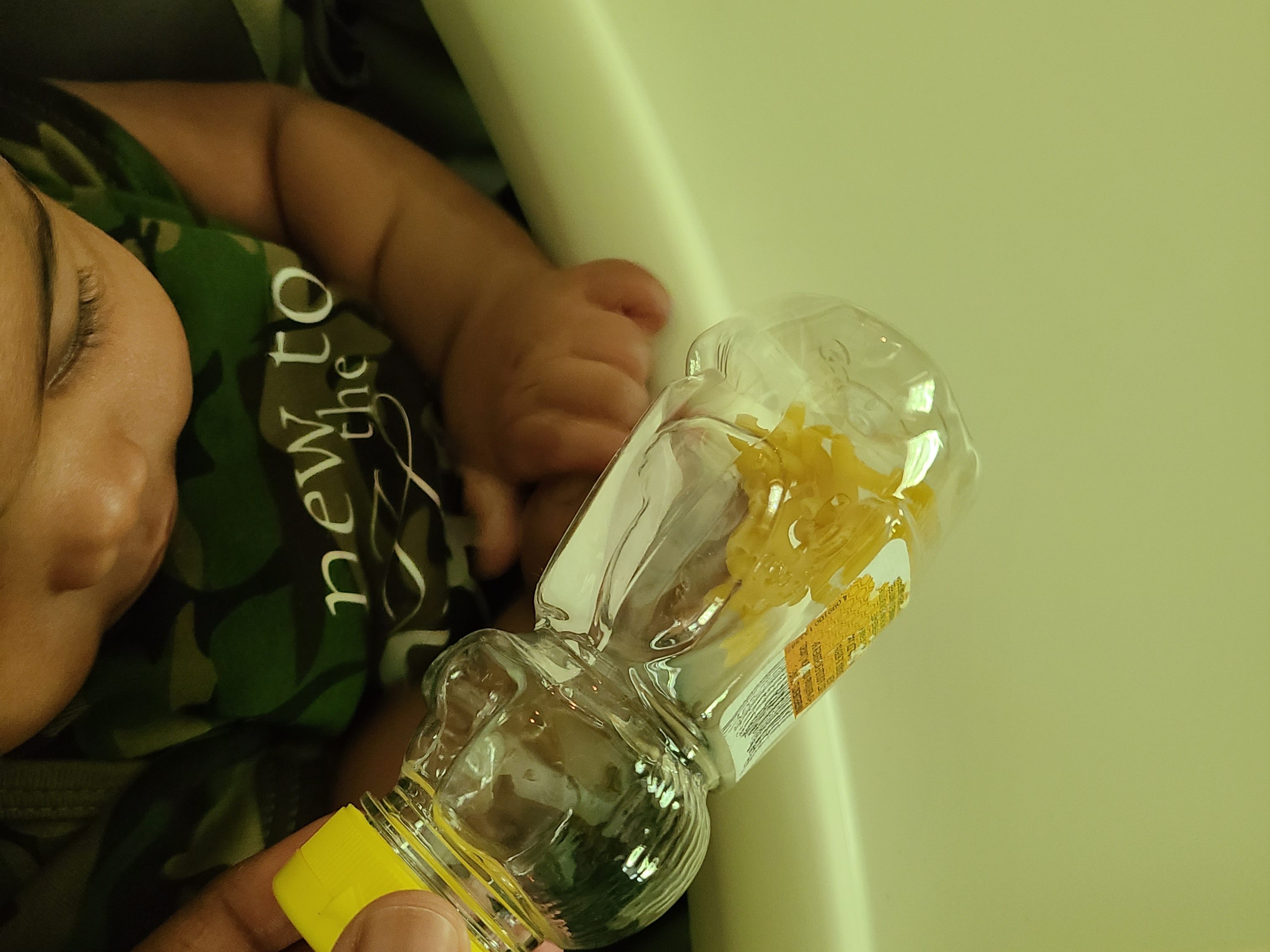 One more picture of Miss Baby with a makeshift shaker — empty honey bear with a few macaroni noodles!