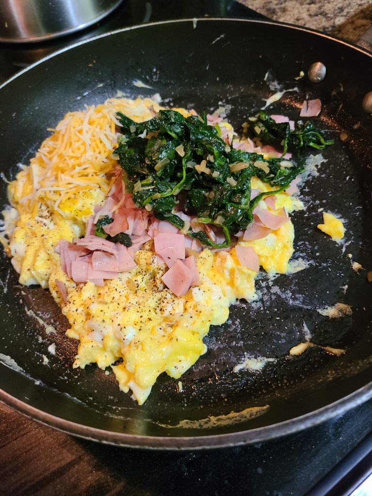 First I sauteed the spinach with a little olive oil, seasoned salt, pepper and minced onions. After the spinach was wilted sufficiently, I set it aside in a ramekin and warmed some chopped deli meat. No need to get it super cooked, just enough to knock the refrigerator cold off…added that to the ramekin too.