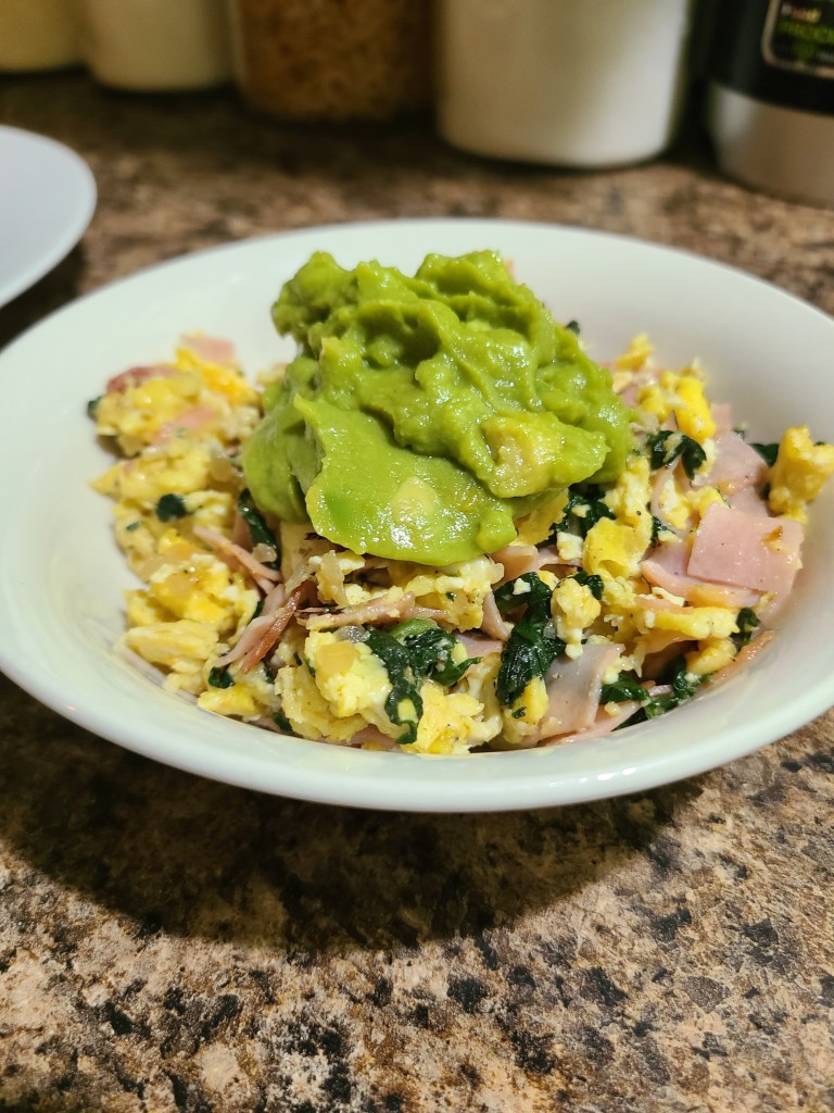 I ate mine with a dollop (ok…it was a whole single serving cup) of guacamole! I added toast and Conecuh sausage to my husband’s plate for a bit more bulk.